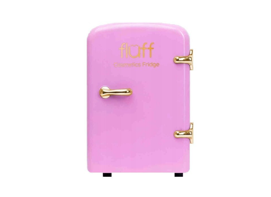 "Fluff" mini kosmetikos šaldytuvas. Rožinės spalvos su aukso spalvos rankenėlėmis.
