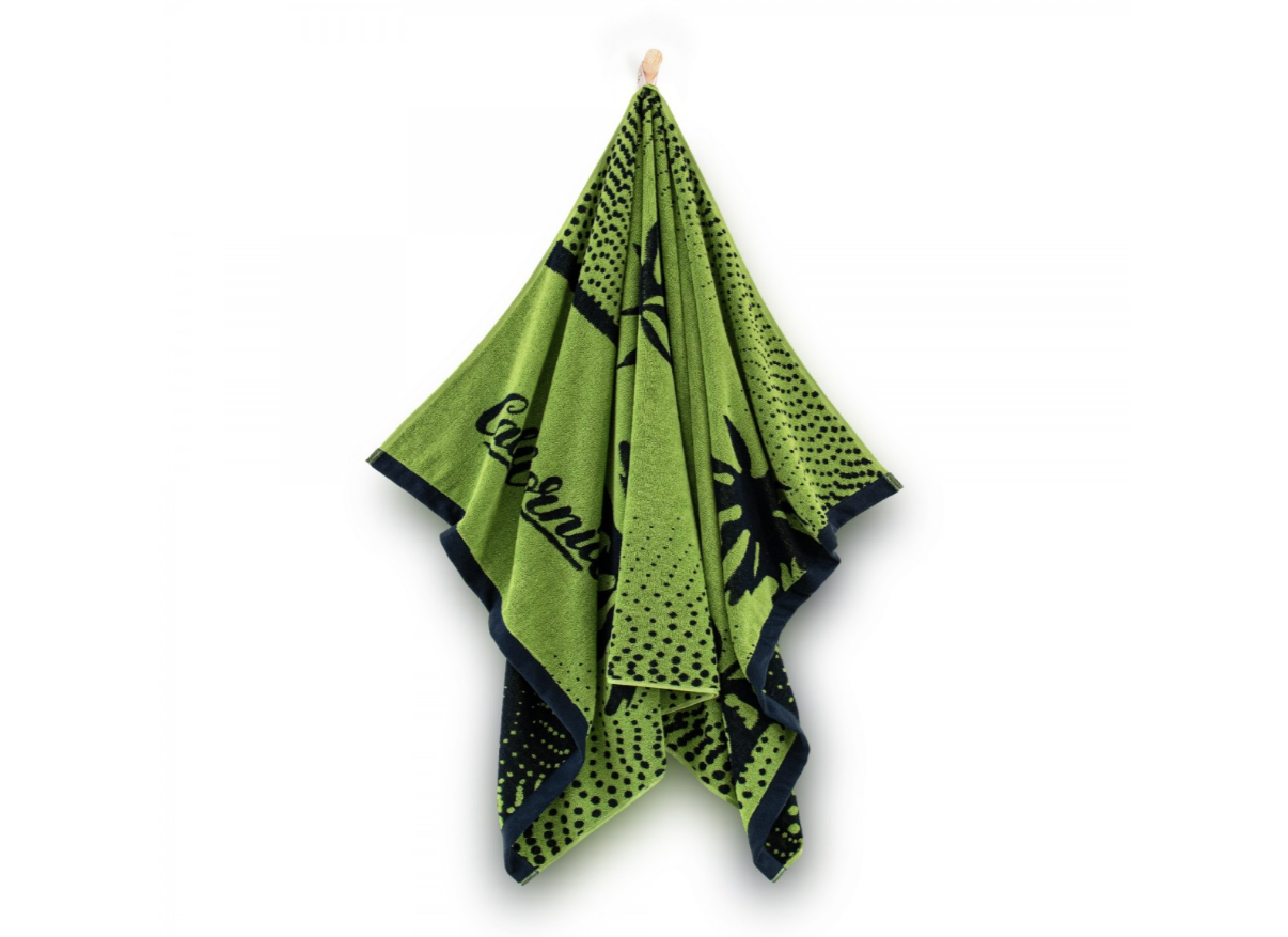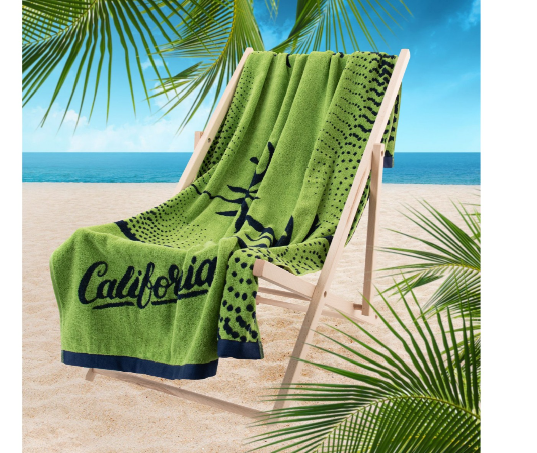Didelis formatas užtikrina komfortą deginantis saulėje ar ilsintis ant gulto, o akį traukiantis raštas su palmės motyvu ir užrašu „Kalifornija“ suteikia energijos bet kokiai šventinei aprangai.