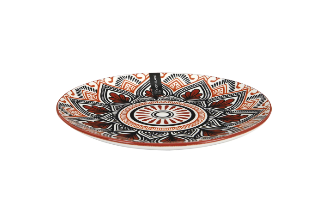 Išskirtinis mandala stiliaus desertinė lėkštė, dekoruotas ryškiais oranžinės ir raudonos spalvų raštais.