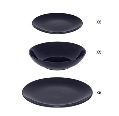 6 plokščios lėkštės 26 cm, 6 gilios lėkštės 21 cm, 6 desertinės lėkštės 20 cm