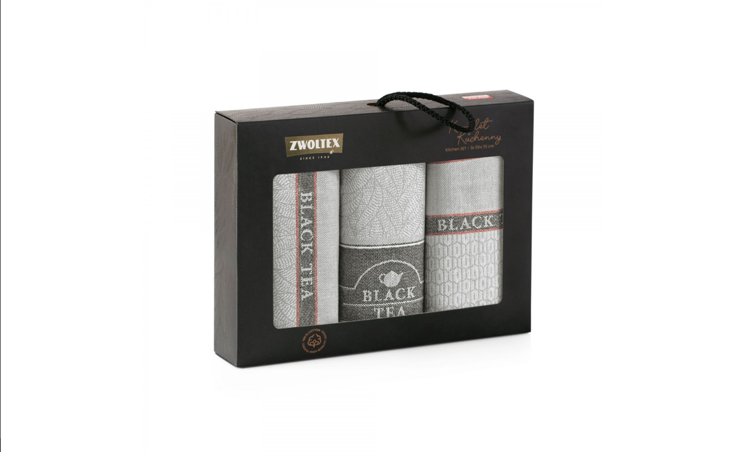 „Black Tea“ – tai unikalaus dizaino medvilninių rankšluosčių serija, puikiai tinkanti šeimos ar socialiniams susibūrimams. Dviejų pilkos spalvos atspalvių derinys suteikia kolekcijai subtilų ir jaukų, virtuvės pojūtį. Lapų motyvas tikrai patiks visiems arbatos mėgėjams. Rinkinį sudaro trys žakardo austi rankšluosčiai, kurių matmenys – 50x70 cm.