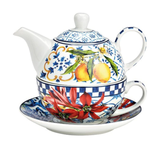 Spalvingas porceliano arbatos rinkinys, dekoruotas elegantiškais gelių ir vaisių motyvais. Puikiai tinka jaukiomis arbatos akimirkomis ar kaip išskirtinė dovana.